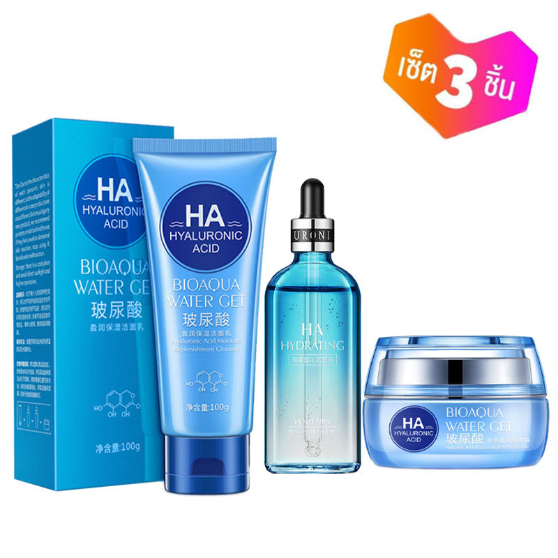 ( สินค้าขายดี / ของแท้ พร้อมส่ง ) BIOAQUA HAครีมล้างหน้า + HA เอสเซ็นส์ + HAครีมให้ความชุ่มชื้นและลบริ้วรอย ชุดสามชิ้น