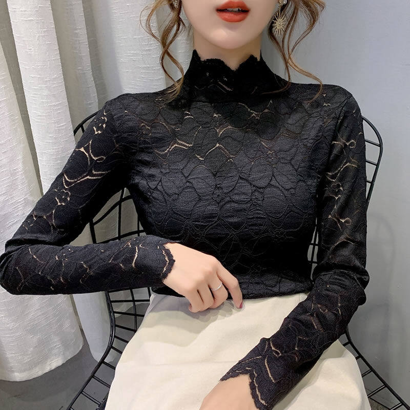 เสื้อเชิ้ตมีขอบล่างลายลูกไม้ผู้หญิงกลวงบางครึ่งคอสูงด้านบน