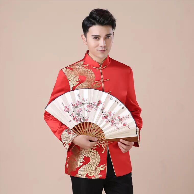เสื้อจีน ผ้าเมืองคอจีนกระดุมจจีนแขนยาวนอกสีดำในสีแดง S 165CM M 170CM L174CM XL180CMหน้าอกS41-42 M43-44 L45-46 XL47-48