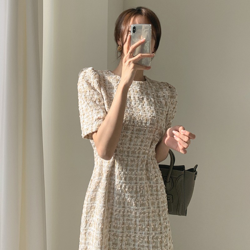 สาธารณรัฐเกาหลีเก๋สไตล์ฝรั่งเศสคนดังแนวย้อนยุคปลอกคอกลมแขนพัฟคำชุดกระโปรงหญิงรัดเอวแลดูผอมกระโปรงกระโปรงสั้น