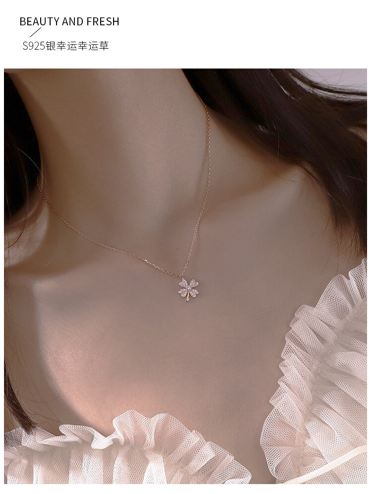 กระพือสร้อยคอผู้หญิงสร้อยคอเงินด้วยเพชรอุปกรณ์เสริมสร้อยคอโคลเวอร์สี่ใบของขวัญโซ่ไหปลาร้าแฟชั่น