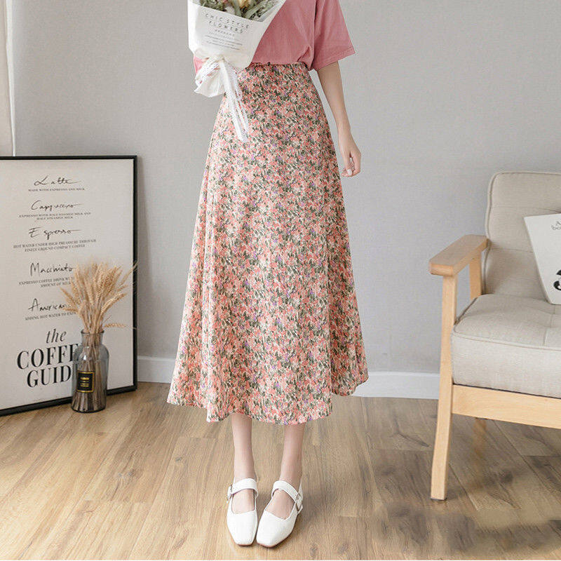 กระโปรงยาวลายดอกไม้ผู้หญิงเอวสูงกระโปรงชีฟองเดซี่ยาว